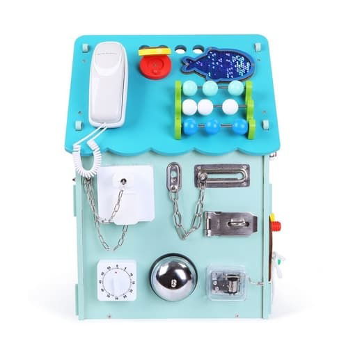 Od zvonku až k telefonu! Tento domeček přináší spoustu zábavy, díky které bude moci Vaše dítě rozvíjet svou zručnost, zvídavost a zejména jemnou motoriku. Zámky, pásky a tkaničky dávají dítěti možnost procvičovat různé vázaní, spojování, otáčení či otevírání a připravit se tak zábavným způsobem na každodenní úkony. Mimo aktivit zapojující smyslové dovednosti deska disponuje i edukativními prvky jako např. počítadlo nebo hodiny. Domeček se dodává složený v krabici.