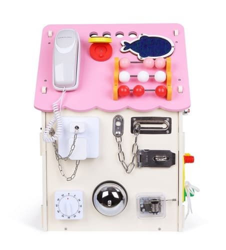 Od zvonku až k telefonu! Tento domeček přináší spoustu zábavy, díky které bude moci Vaše dítě rozvíjet svou zručnost, zvídavost a zejména jemnou motoriku. Zámky, pásky a tkaničky dávají dítěti možnost procvičovat různé vázaní, spojování, otáčení či otevírání a připravit se tak zábavným způsobem na každodenní úkony. Mimo aktivit zapojující smyslové dovednosti deska disponuje i edukativními prvky jako např. počítadlo nebo hodiny. Domeček se dodává složený v krabici.