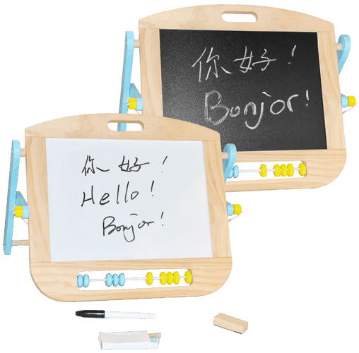 Stolní oboustranná tabule nabízí dětem ideální prostor pro rozvoj fantazie, kreslení i první školní dovednosti. Z jedné strany je magnetická tabule na psaní suchými stíratelnými fixy, z druhé klasická černá tabule na křídu. Součástí balení je fix, křídy, plstěná houba i malé dvoubarevné počítadlo, které dětem pomáhá s prvním seznamováním s čísly. Stabilní dřevěná konstrukce s certifikací FSC splňuje aktuální bezpečnostní normy a zaručuje dlouhou životnost. Skvělá didaktická pomůcka do pokojíčku i herny.
