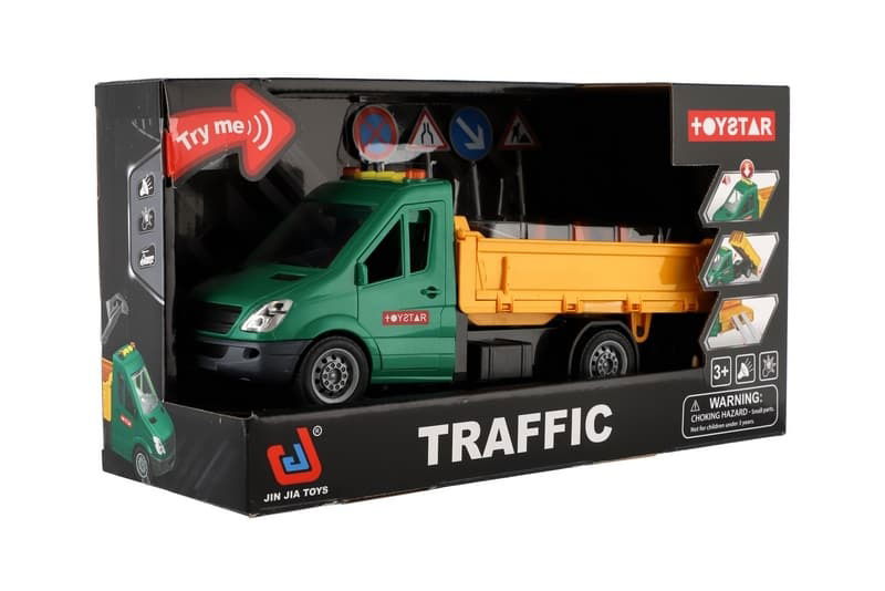 Balení obsahuje krom samotného auta i příslušenství potřebné k práci na silnici, jako je kolečko, dopravní značky, kužely.