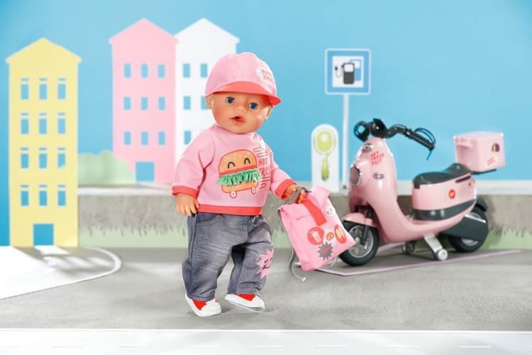 Oblečení ladící k BABY born Vozíku s občerstvením zahrnuje nejen tričko s potiskem hamburgeru a ležérní džíny, boty a kšiltovku, ale také batoh se spoustou míst...