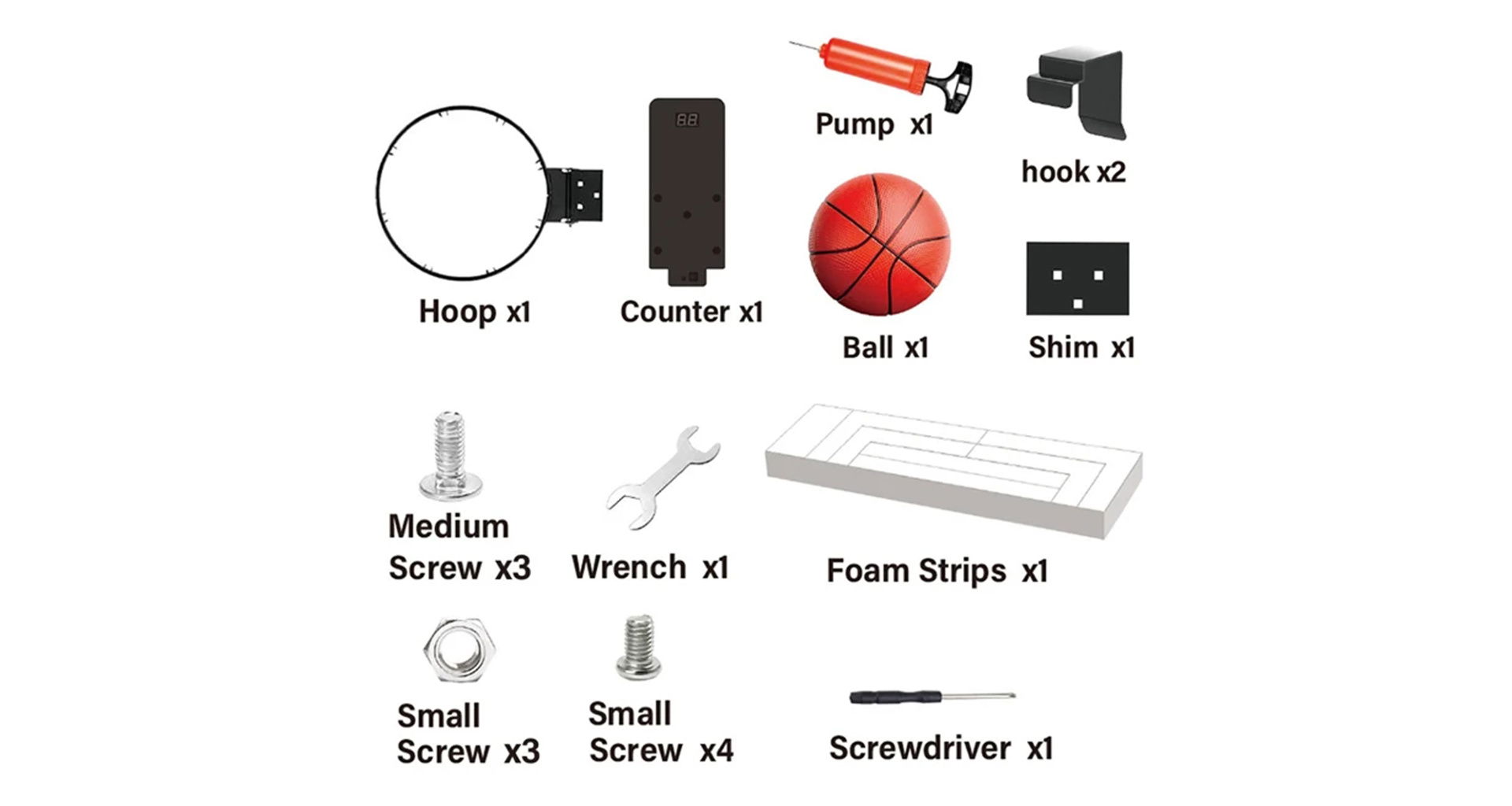 - Počet částí: deska, síť, obruč, počítadlo, míč, pumpa, 2 háčky, 3 střední šrouby, klíč, pěnový proužek, 4 podložky, 4 malé šrouby, šroubovák