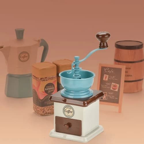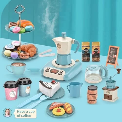 Sada obsahuje vše potřebné, aby si děti mohly hrát na přípravu a podávání kávy, včetně espresso stroje, kávových hrnků, talířků, a dokonce i uměleckých dortíků.
