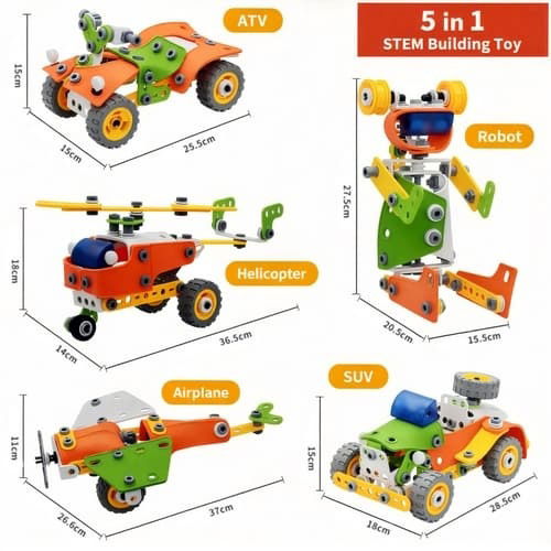 Obsahuje 164 dílků, které lze různě kombinovat a přestavovat – od autíček a letadel až po roboty nebo cokoli, co si dítě vysní.