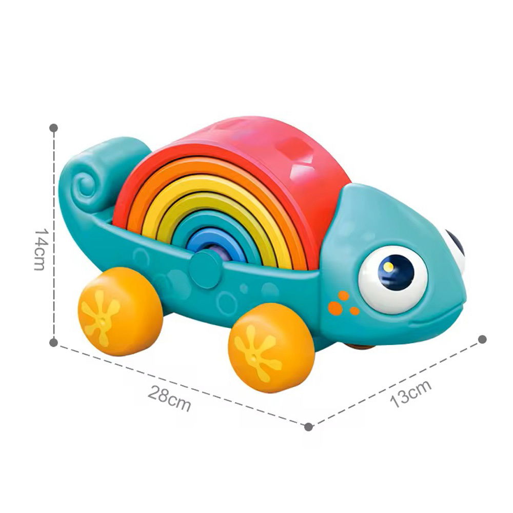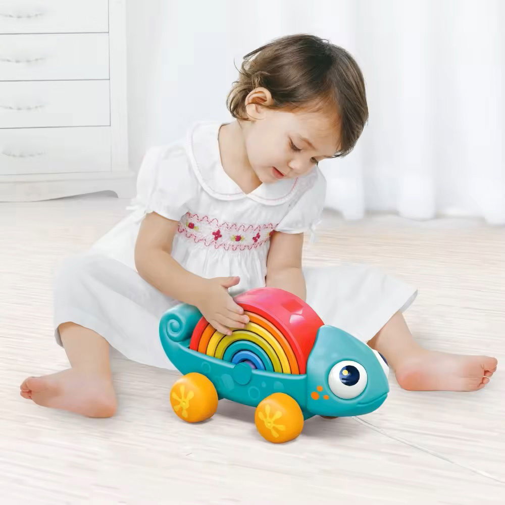 Tahací chameleon s pestrobarevnými duhovými kruhy je navržen tak, aby stimuloval smysly vašeho dítěte a podporoval motorické dovednosti.
