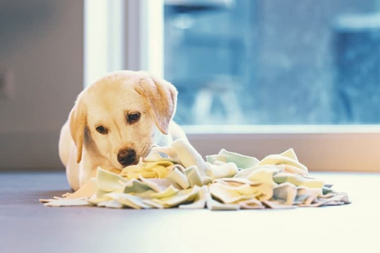 Čmuchací podložka pro štěňata z krátkých a dlouhých pruhů flísu.