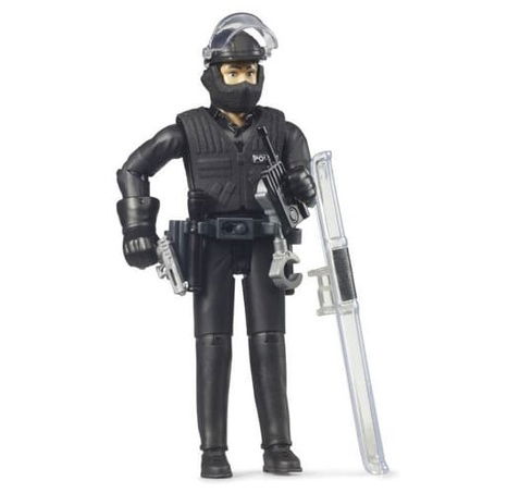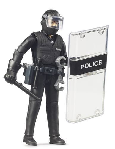 Ve světě BRUDER se tato figurka stává důležitou součástí policejních operací. Policista je vybaven speciální výstrojí včetně ochranného štítu, díky kterému může bezpečně postupovat při zásahu a chránit sebe i své kolegy. Děti tak mohou vytvářet realistické policejní scénáře – od zajištění prostoru až po koordinovaný zásah proti nebezpečným situacím.
