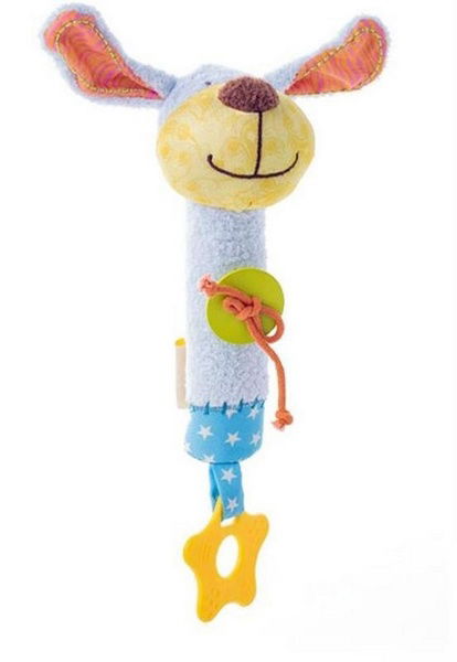 Chrastítka jsou jednou z věcí, které miminko upotřebí. Pejska můžete přivázat na postýlku, autosedačku, nebo lehátko či hrazdičku. Chrastítka naučí miminka rozpoznávat zvuky, rozvíjí pohybovou koordinaci a smysly. Toto chrastítko je velmi oblíbené u dětí, při stisknutí tělíčka, pejsek zapíská. Pejsek obsahuje stimulační prvky, jako jsou: plastové kousací tvary, knoflík na bříšku, který vybízí k bližšímu prozkoumávání.