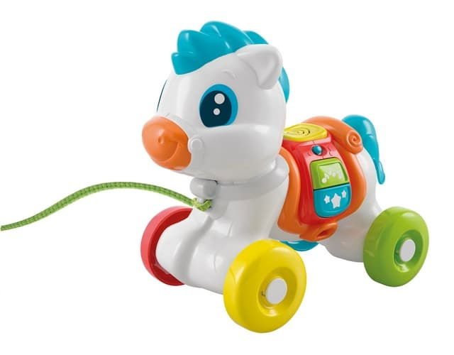Přátelský tahací poník má na sedle řadu knoflíků, které ho oživují, nutí ho jíst, smát se a bavit dítě zvukovými efekty. Díky interaktivním tlačítkům, kolečkům a vodítku podporuje poník smyslový vývoj a také zlepšuje motorické schopnosti. Ikonická postava zbožňovaná dětmi z řady Baby Clementoni.