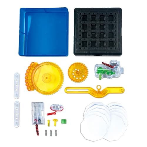 Stavebnice obsahuje modulární modro-černý podstavec s motorkem a sadou žlutých ozubených kol, která se po zapojení točí a pohybují ramenem s fixem.