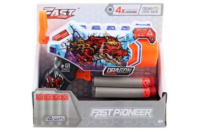 Dětská pistole na pěnové náboje z řady Fast Pioneer zaujme na první pohled svým atraktivním designem s výrazným motivem draka. Tato kompaktní mechanická zbraň je vyrobena z odolného plastu a její ovládání je přizpůsobeno dětem od 8 let. Součástí sady jsou 4 pěnové náboje, které jsou navrženy pro bezpečné hraní. Díky svým rozměrům a lehké konstrukci se pistole snadno ovládá a je ideální pro akční hry v interiéru i venku.