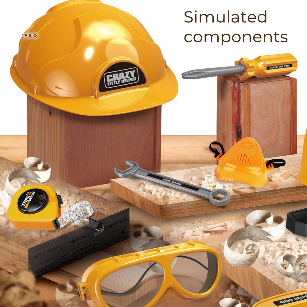 Ochranná výbava: Důležitá součást hry – žlutá stavební helma s nápisem "CRAZY LITTLE HELPER" a ochranné brýle ve žlutém provedení.