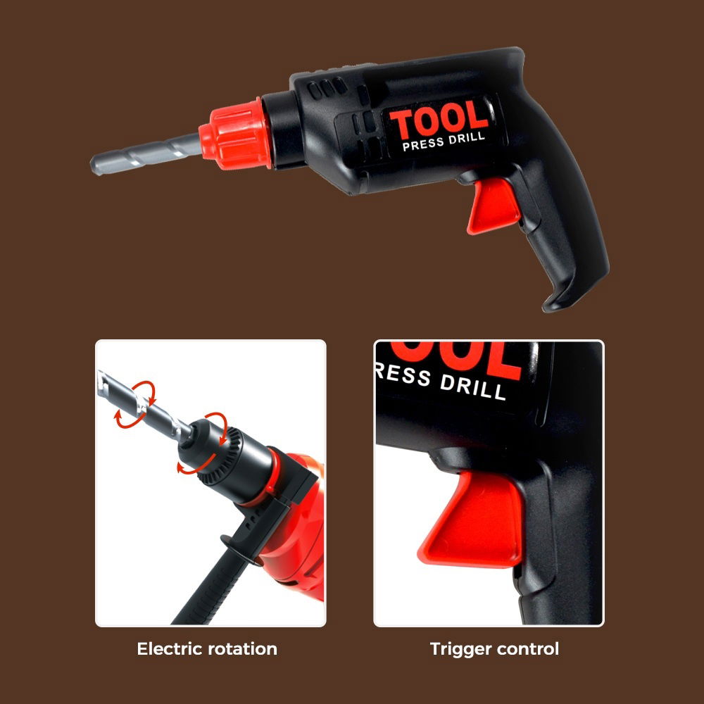 Tato sada obsahuje realisticky vypadající dětskou vrtačku v černé barvě s červenými akcenty, která je určena pro hru na kutila.