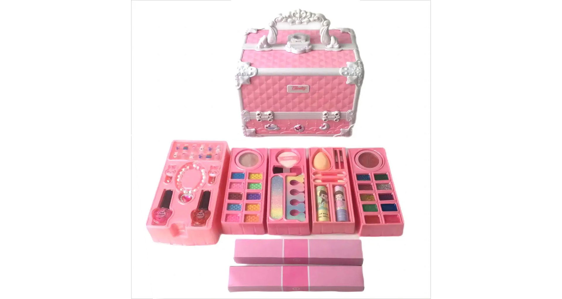 Okouzlující dětský kosmetický kufřík v růžové barvě, který je navržen tak, aby dětem poskytl bezpečný a zábavný úvod do světa líčení a kosmetiky. Tento rozkládací kufřík s elegantními detaily připomínajícími šperkovnici obsahuje pestrou škálu barevných očních stínů, lesků na rty, tvářenek, laků na nehty a dalších doplňků pro zkrášlení. Celý set je vyroben z bezpečných materiálů a podporuje kreativitu a interakci při hraní.