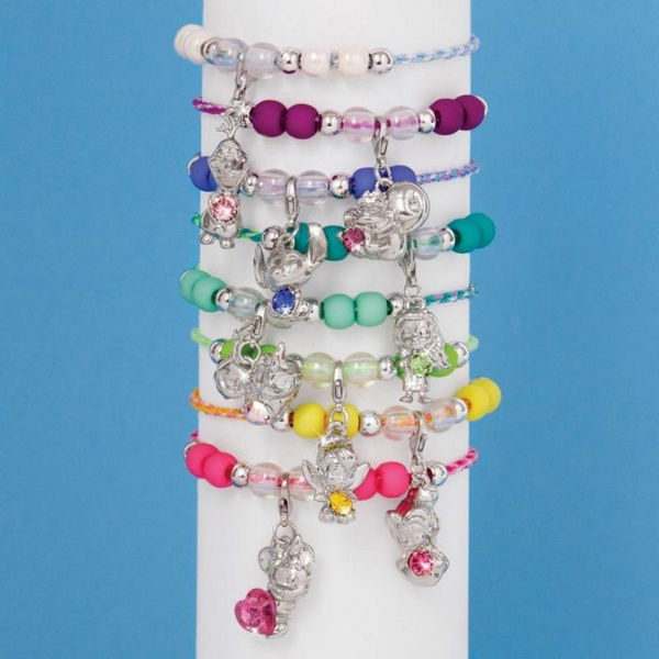 Každá sada obsahuje 1 přívěsek postavičky Disney zdobené krystalem Swarovski, 1 pletenou šňůru v jedinečné barvě postavičky Disney, 11 korálků, 1 zamykací krabičku ve tvaru srdce, 1 klíč, 1x40stránkovou brožuru Disney profilující postavy ve sbírce a návod.