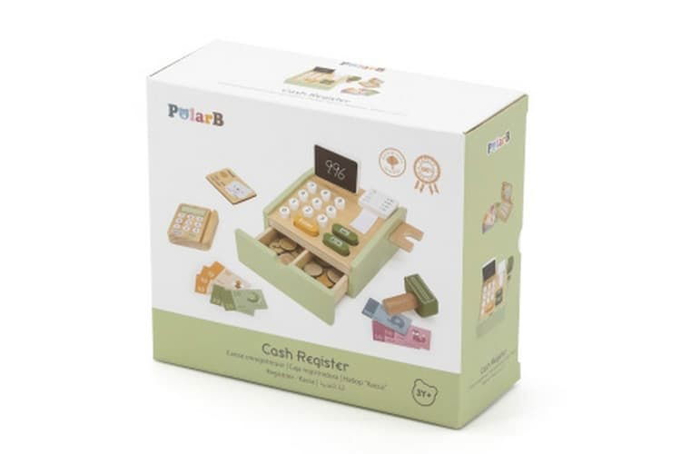 Dřevěná pokladna. Balení obsahuje 8 papírových bankovek a 14 dřevěných mincí. Rozměry balení cca 19x17x7 cm. Rozměry pokladny 18,5x15,8x11 cm. Věk 3+...