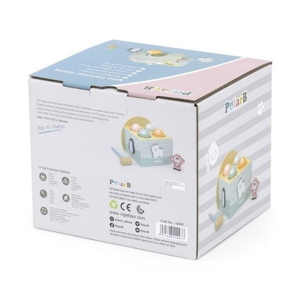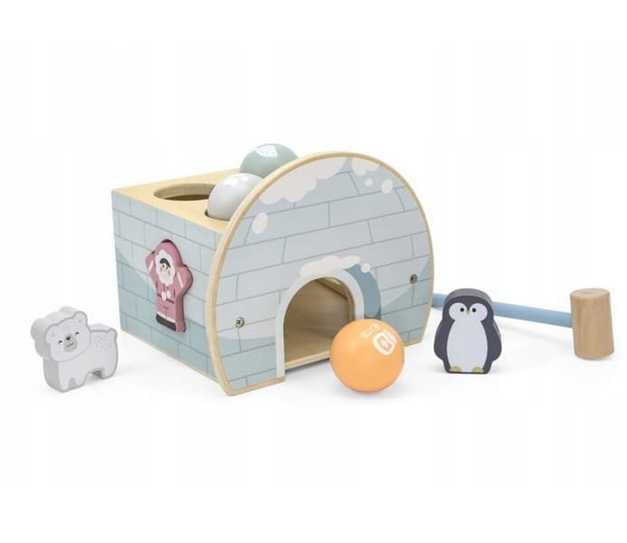 Balení obsahuje 4 dřevěné kuličky o velikosti 5 cm a dřevěné kladívko na zatloukání , 3 tvary na vkládání. Rozměr balení 18 x 15 x 15,5 cm. Věk 18 m+...