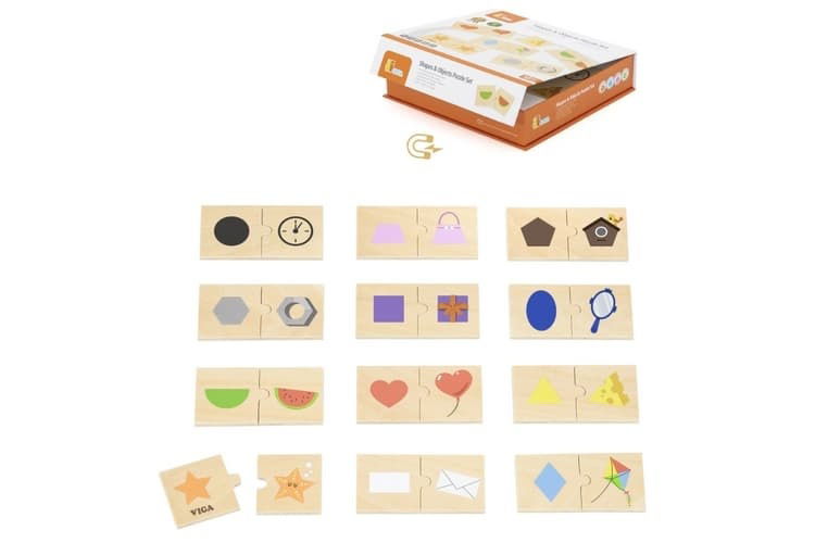 Dřevěné puzzle dvojice s motivem tvarů rozvíjí u dětí schopnost rozlišovat tvary, podporuje jemnou motoriku a logické myšlení. Každý dílek má obrázek a odpovídající tvar, který k němu patří, takže děti při hraní učí párování a správnou vizuální koordinaci. Puzzle je vhodné pro malé děti od 18 měsíců a je baleno v praktické krabici.