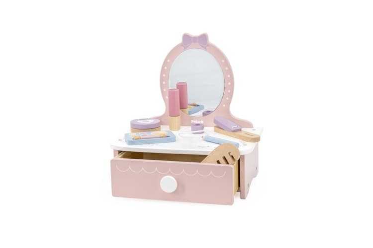 Dřevěná toaletka se stolečkem a doplňky pro malé parádnice, podporující fantazii a kreativní hru.