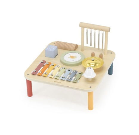 Dřevěný hudební stolek s několika nástroji podporující hudební vnímání, jemnou motoriku a přirozený rozvoj dětské kreativity.