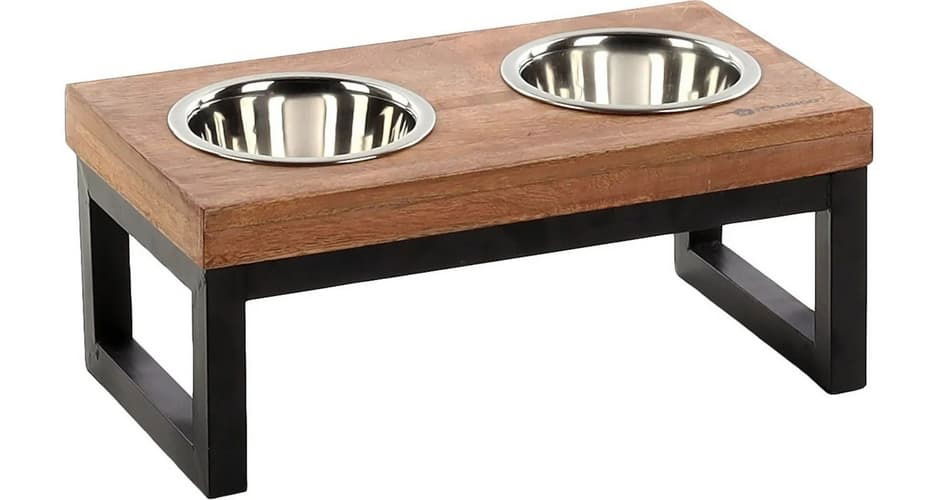 Stabilní kovová konstrukce s černou povrchovou úpravou a ochranou proti poškrábání podlahy. Deska z mangového dřeva se 2 vyjímatelnými miskami. Nerezové misky lze mýt v myčce. Pro kočky a psy všech velikostí a plemen. Určen pro vnitřní použití.