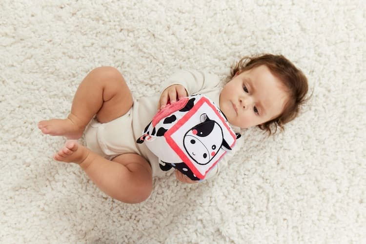 Senzorická plyšová kostka GAGAGU s motivy tygra a krávy je určena pro děti již od 3 měsíců a poskytuje pestrý smyslový zážitek. Každá strana kostky je vyrobena z odlišného materiálu a nabízí různé textury, šustivé prvky, zrcátko, plyšovou kapsičku s míčkem nebo geometrické vzory. Kostka stimuluje hmat, zrak a jemnou motoriku dítěte a podporuje jeho objevování prostřednictvím hry. Vyčnívající prvky zvířátek, stuhy a kapsička rozvíjejí koordinaci rukou a podporují samostatné uchopování.