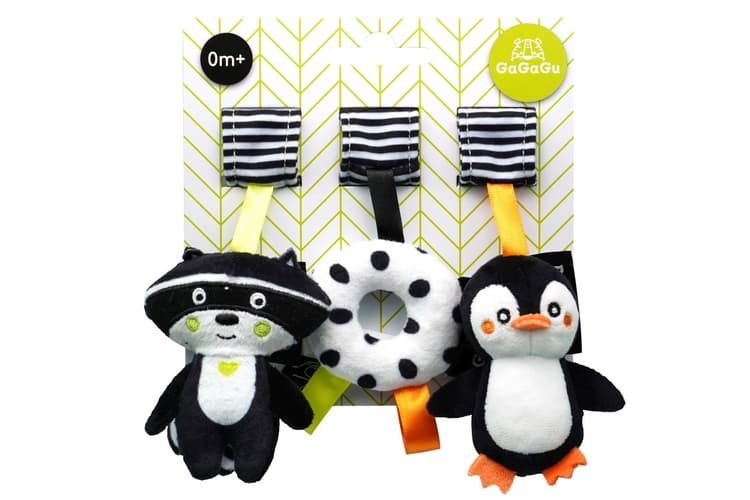 Závěsná plyšová hračka GAGAGU s motivy mývala, tučňáka a Donuta je ideální pro nejmenší děti od narození. Hračka kombinuje kontrastní barvy a vzory, které stimulují zrak dítěte, a plyšové prvky a stuhy, které podporují jemnou motoriku a koordinaci rukou. Díky suchému zipu lze přívěsek snadno připevnit na kočárek, postýlku, houpačku nebo autosedačku. Plyšové hračky jsou odnímatelné a mohou se využít samostatně, například na hrací podložce Panda.