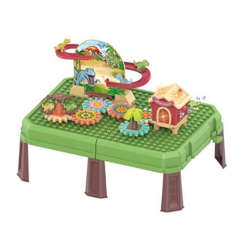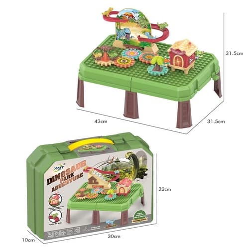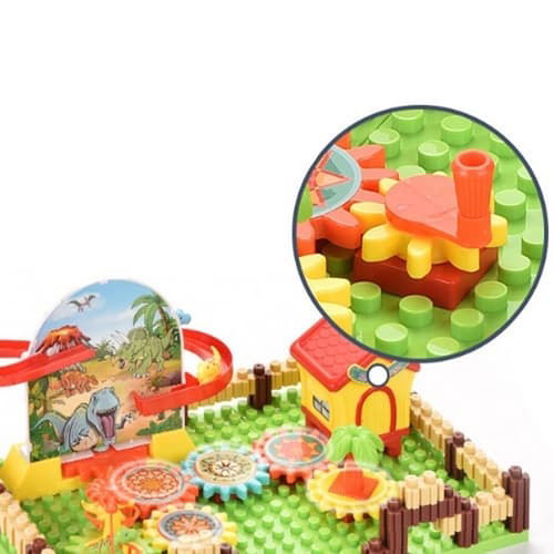 Děti si mohou postavit vlastní dinopark s pohyblivými ozubenými koly, dráhou pro dinosaury, domečkem, stromy, kužely a dekorativními prvky.