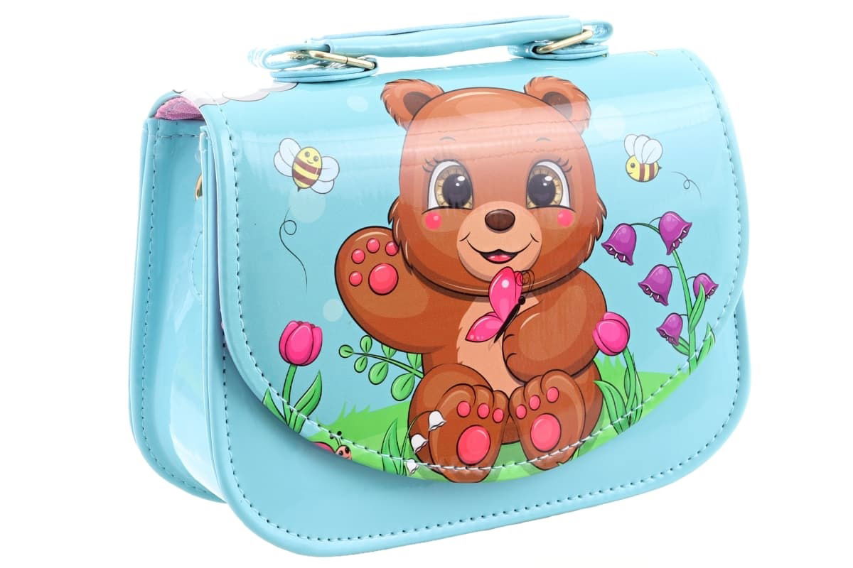 Kabelka s motivem medvídka. Lesklý materiál. Jedna kapsa, zapínání na druk. Rozměry kabelky 18x14x7 cm. Výrobek není hračka...