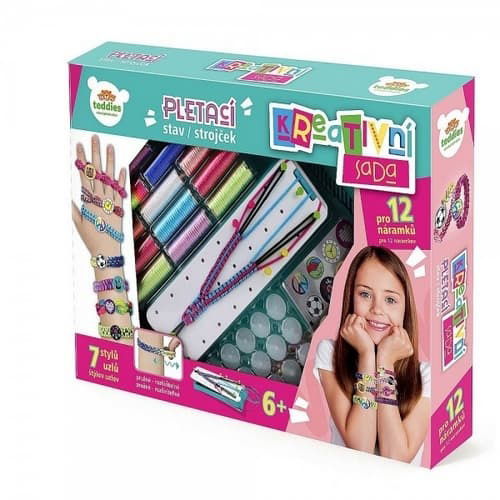 Kreativní sada obsahuje pletací stav, příze, spojovací knoflíčky a samolepkyDěti si mohou uplést 12 náramků a vybrat si mohou ze 7 stylů uzlůRozměry balení 38cm...