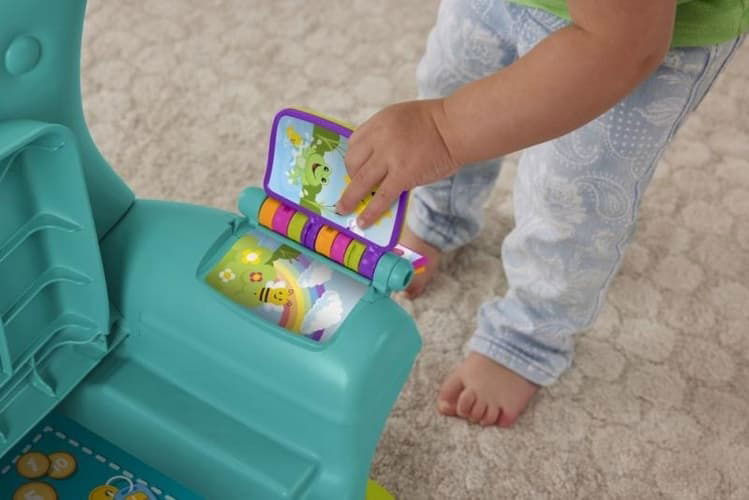 Jakmile se do něho děťátko posadí, čeká na něj spousta zábavných aktivit, včetně svítícího dálkového ovladače s tlačítky s čísly a tvary, listovací knížky a nadzvedávajícího polštářku se skrytými překvapeními.