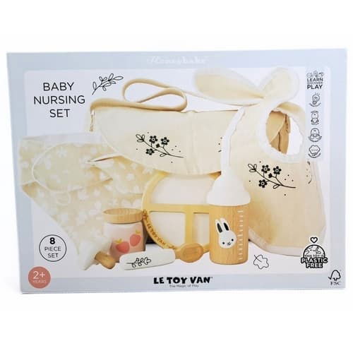 Představivá sada pro malé pečovatele a pečovatelky. Tato krásná souprava obsahuje vše, co budou děti pro péči o plyšáky a panenky potřebovat. V balení roztomilá textilní přebalovací taška s popruhem, s ozdobnou ilustrací listů. Uvnitř najdete všechny nezbytnosti, dudlík, bryndák, plenku, talíř, lžíci, přesnídávku a lahvičku. Vyrobeno s láskou z kombinace přírodní bavlny a pevného dřeva. Všechny doplňky jsou vhodné pro plyšáky a panenky ve velikosti cca 30 až 35 cm.