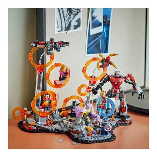 Stavebnice LEGO Marvel 76323 přináší ikonickou scénu z filmu Avengers: Endgame. Obsahuje detailní modely hrdinů a padouchů, včetně Thanose, a umožňuje dětem sestavit dynamickou scénu s portály a výbušnými efekty.