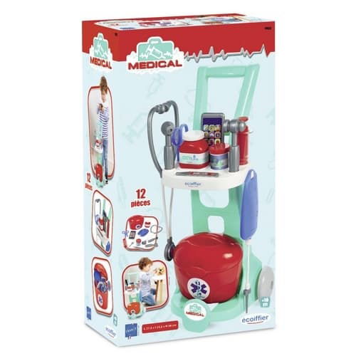 Vozík pro malé lékaře zahrnuje lékařský kufřík, stetoskop, infuzi a další příslušenství - stříkačku, teploměr, nůžky atd. pro zjištění zdravotního stavu pacient...