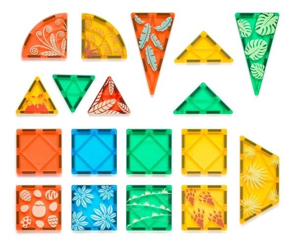 Obsah sady - 23 dílků: 8 čtvercových dílků, 7 trojúhelníkových dílků, 2 půlkruhové dílky, 1 čtyřúhelníkový dílek, 5 dinosaurů.