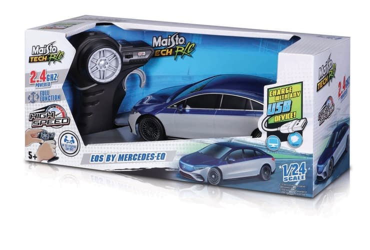 Mercedes-Benz EQS1:24 RC Premium. Model sportovního vozu značky Maisto na dálkové ovládání. V autíčku je zabudovaná lithiová baterie, kterou lze dobíjet přes USB kabel (je součástí).