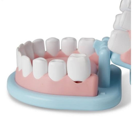 Součástí sady je 25 dílů, včetně nadměrné sady zubů, zubařských nástrojů, škrabky, zrcátka, zubní niti, ústní sprchy a kelímku. Děti si mohou vyzkoušet čištění zubů, nasazování rovnátek nebo ošetření kazu – přesně jako opravdový zubař.