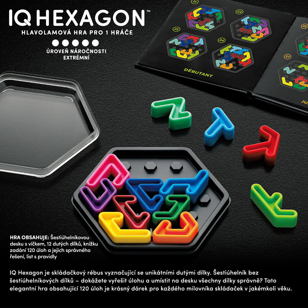 Luxusní logický hlavolam pro jednoho hráče s unikátními dutými šestiúhelníkovými dílky a 120 výzvami. Prověřte své logické myšlení a prostorovou představivost s tímto prémiovým rébusem ze série IQ.