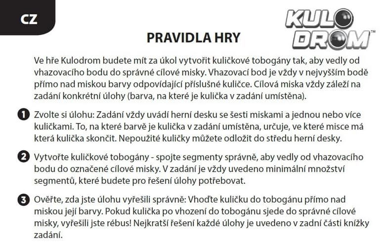 Hra obsahuje: herní desku s 6 miskami, 6 kuliček, 2 sloupky, 5 kratších ramp, 2 delší rampy, knížku zadání s 80 rébusy od snadných po náročné