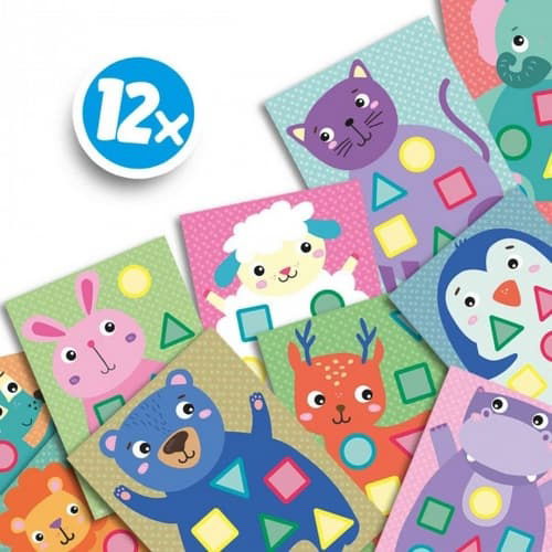 Děti se naučí rozpoznávat tvary a barvy. Obsahuje 12 karet se zvířátky a plata se samolepkami. Zvíře na každé kartě obsahuje skupinu tvarů v různých barvách. Úkolem dítěte je nalepit na zvířátka všech příslušné samolepky. Zábavná aktivita pro rodiče a jejich děti, kde si děti hravou formou procvičí koordinaci oko-ruka a jemnou motoriku.