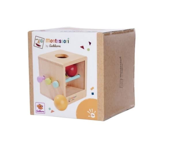 Když jsou tyčky zasunuté v boxu, koule se po vhození do otvoru zasekne uvnitř. Vytažením tyček se koule vykutálí ven. Varianta pro mladší děti: bez zasunutých tyček – vhoďte kouli do otvoru a sledujte, jak se kutálí ven. Montessori box je vyroben ze 100% bukového dřeva s certifikátem FSC a je vhodná pro děti od 1 roku.