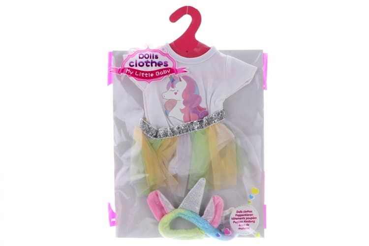 Tento kouzelný set oblečení promění každou panenku v pohádkového jednorožce. Sada se skládá z bílého bodýčka s motivem jednorožce, nadýchané tutu sukýnky v zářivých duhových barvách se stříbrným pasem a stylové čelenky s barevným rohem a oušky. Oblečení je navrženo pro snadnou manipulaci, což dětem od 3 let umožňuje rozvíjet jemnou motoriku při převlékání svých oblíbených hraček. Celý set je dodáván v praktickém balení, které chrání doplňky před poškozením.
