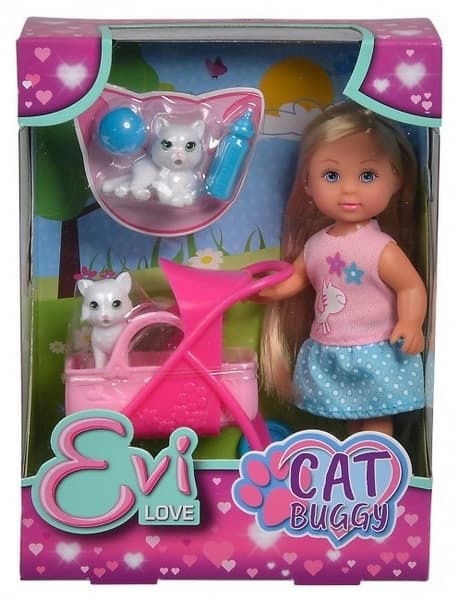 Panenka Evička s kočárkem pro kočičky Krásná panenka Evička se 2 roztomilými kočičkami a kočárkem. Evička může odejmout z kočárku košík pro svoje kočičky. Na k...