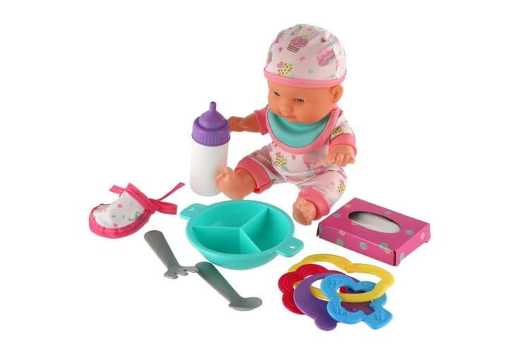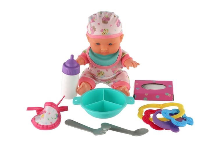 Roztomilá panenka s pevným tělíčkem a doplňky jako lahvička, chrastítko, ubrousky a jídelní set je ideální společník pro hru a péči o miminko.