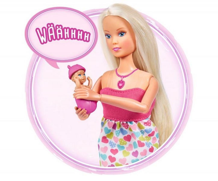 Steffi jako nastávající maminka s miminkem v bříšku. Když stiskneme tlačítko ve tvaru srdce na jejím náhrdelníku, uslyšíme tlukot srdce miminka. Když se dítě narodí a vykoukne z bříška, dá o sobě vědět křikem. Když pak znovu stiskneme srdíčko na náhrdelníku, postupně uslyšíme další zvuky - pláč, usínání při ukolébavce a smích. Sada obsahuje také rodný list k vyplnění, čepičku a zavinovačku pro novorozence, hračku medvídka a dětské nosítko. Panenka Steffi má ohebné klouby na loktech a zápěstích. Velikost panenky 29 cm.