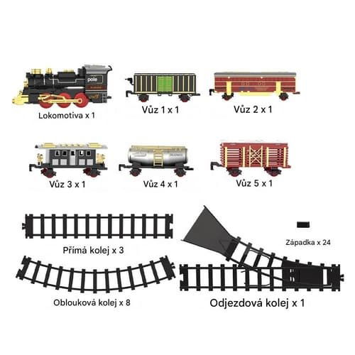 Retro klasický vláček s kolejemi, světlem a zvukem