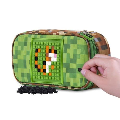 Na přední straně je umístěn unikátní silikonový PIXIE CREW creative panel TM zelené barvy. Čtverec je o velikosti 10 x 10 bodů a k dispozici máte 97 pozic pro nekonečné množství motivů na každý den díky PIXIES (pixelům), které můžete kdykoli sundat a vyměnit za jiné. Ke každému penálu zdarma přikládáme balíček s 50 malými černými pixely pro sestavení obličeje CREEPERa.