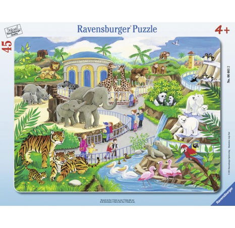 Deskové puzzle s motivem Návštěvy ZOO. Složený obrázek má velikost 32,5 x 24,5 cm. Obrázek se složen z 45 dílků.