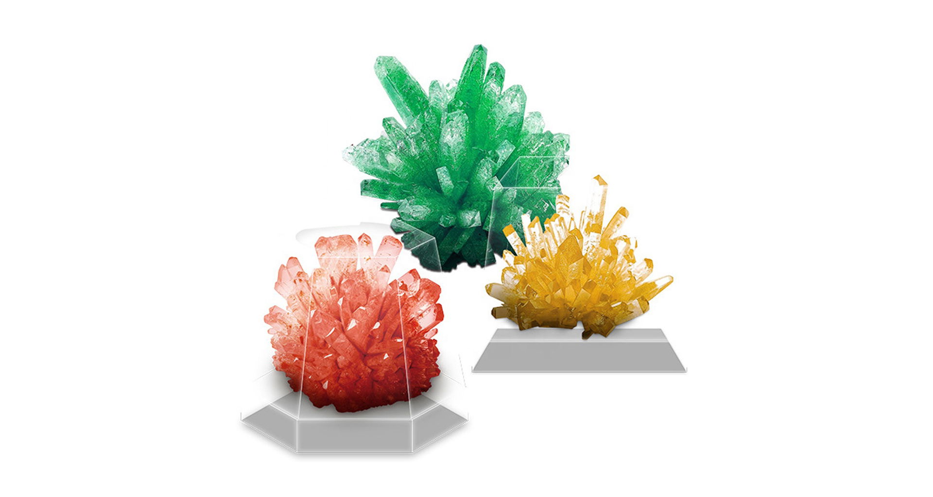 Balení obsahuje vše potřebné pro pěstování dvou různých krystalů (zelený a žlutý/oranžový) v průhledných nádobách, které se po dokončení promění v působivé vědecké exponáty.