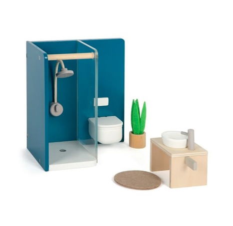 small foot Nábytek do domečku pro panenky Koupelna je stylová a detailně zpracovaná sada, která promění každý domeček pro panenky v moderní koupelnu. Realistické provedení jednotlivých prvků podporuje přirozenou dětskou hru a rozvíjí představivost při každodenních scénářích z běžného života. Součástí sady je sprchový kout s akrylátovou zástěnou a nastavitelnou výškou sprchy, závěsné WC, moderní umyvadlo, malý ručník a kobereček. Kombinace dřeva, látky, kovu, plastu a plsti působí autenticky a zároveň je uzpůsobena dětským rukám. Hra s koupelnovým nábytkem děti motivuje ke kreativnímu vyprávění příběhů a podporuje jemnou motoriku.